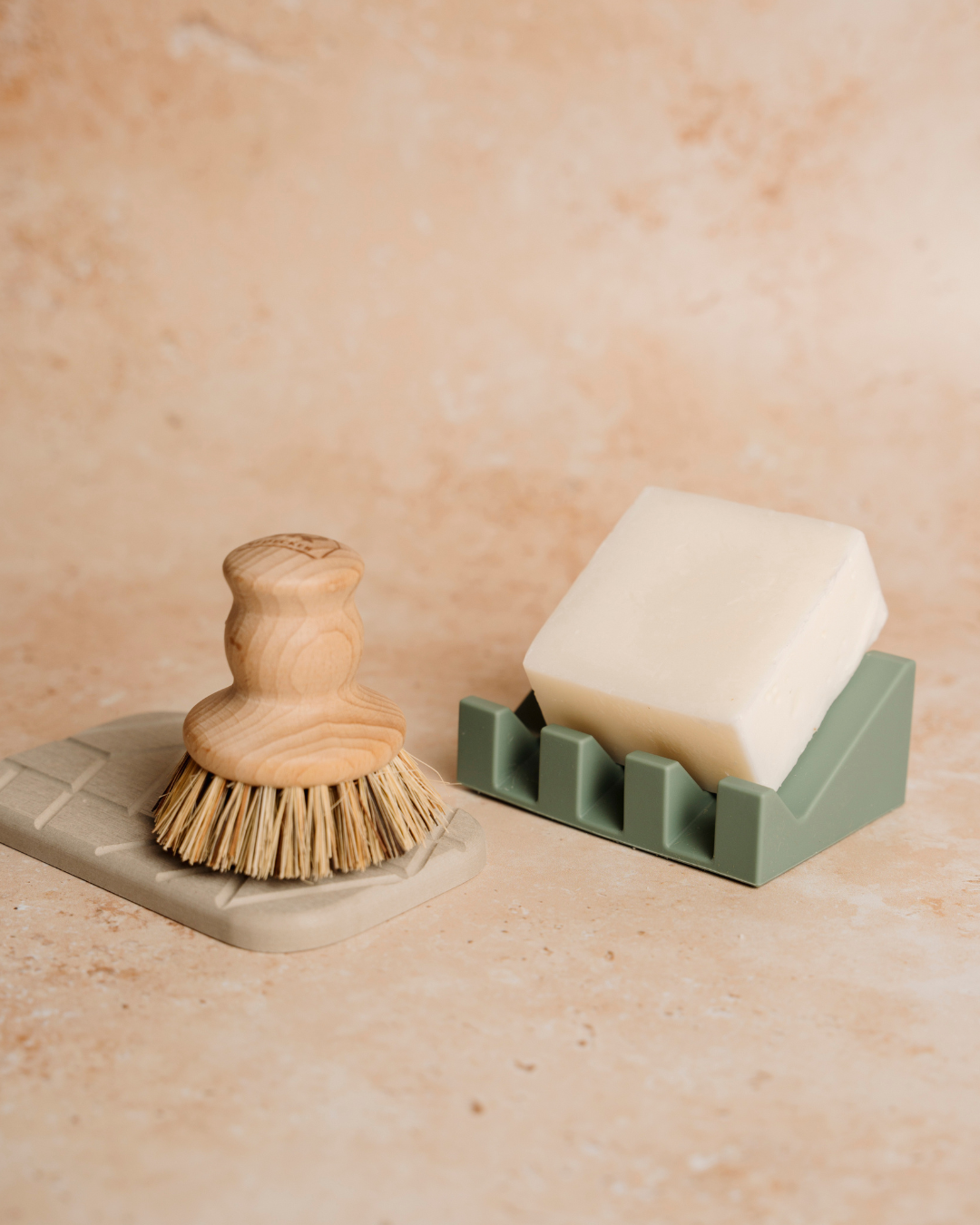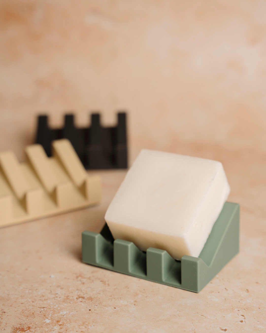 The unique self-draining, waterfall design of this silicone soap dish directs excess water straight into the sink or shower, prolonging the life of bar soap. This versatile soap dish is suitable for use in both the kitchen and bathroom with any type of bar soap, but we love it for our dishwashing soap bars. How to Use: Position the soap dish on the edge of your sink or shower. Complete with convenient suction cups to keep it in place! Easy to Clean: Soap can build up on the soap dish over time. Use a scrub brush to periodically clean out the grooves. Dishwasher safe for deep cleans. Options: Available in black, sand, or sage green. Mother Earth Approved: Made from endlessly reusable, high-quality silicone. Product Dimensions: 3.5”x2.75"x1.5"
